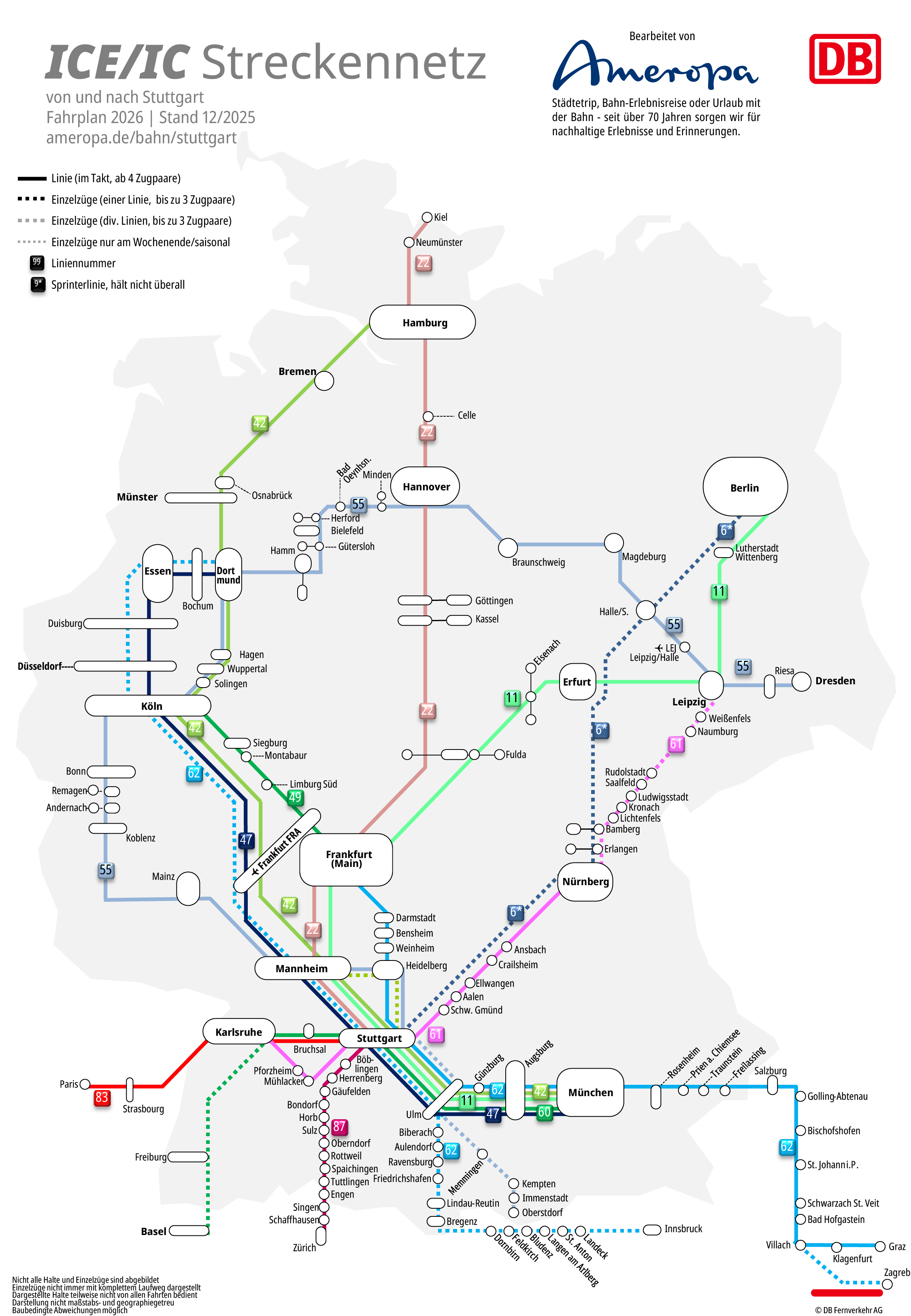 Ab Stuttgart können Sie viele interessante Reiseziele in Deutschland und Europa mit dem Zug erreichen. Die Karte bietet Ihnen eine Übersicht über alle Direktverbindungen. Lassen Sie sich hier inspirieren.