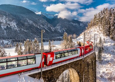Traumhafte Winterkulisse pur: Erleben Sie die Glacier Express-Kurzreise ab/bis St. Moritz nach Zermatt mit Schneelandschaften und wunderbaren Ausblicken.